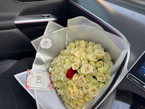 100 White Roses with single Red Rose