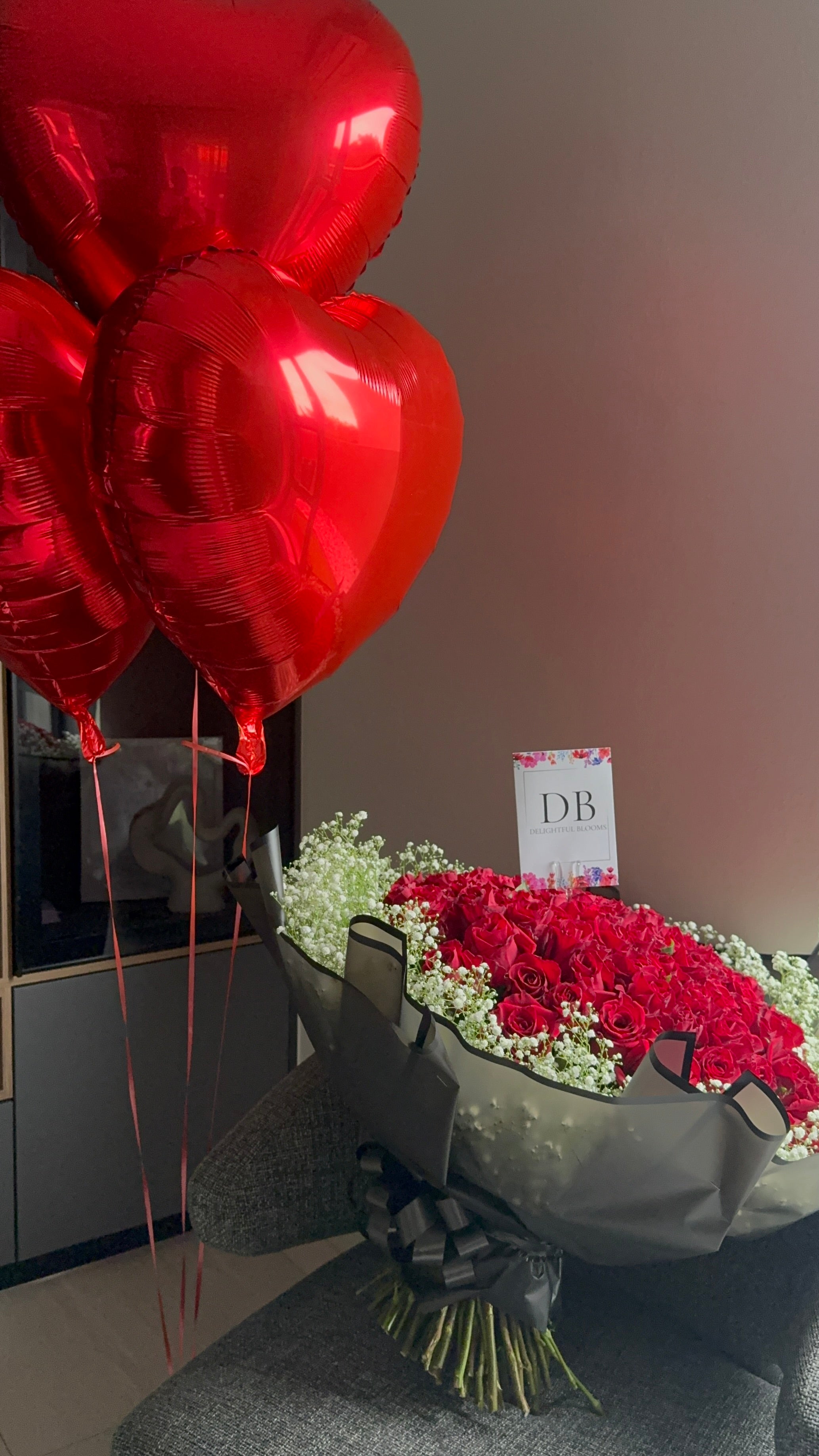 80 Red Roses with Baby’s Breath & 3 Heart Balloons